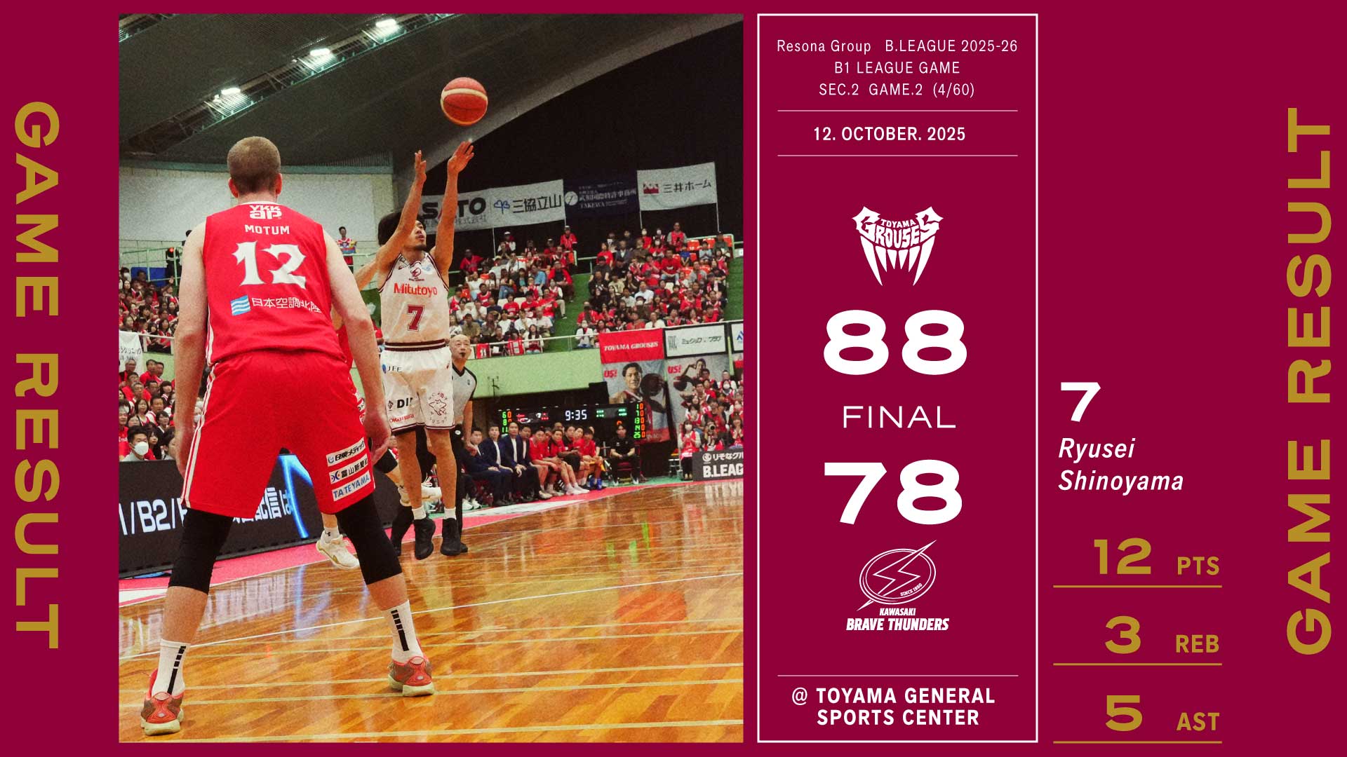 10/12 ○富山 88-78 川崎● りそなグループB.LEAGUE 2025-26 B1リーグ戦 第2節GAME2 (4/60)