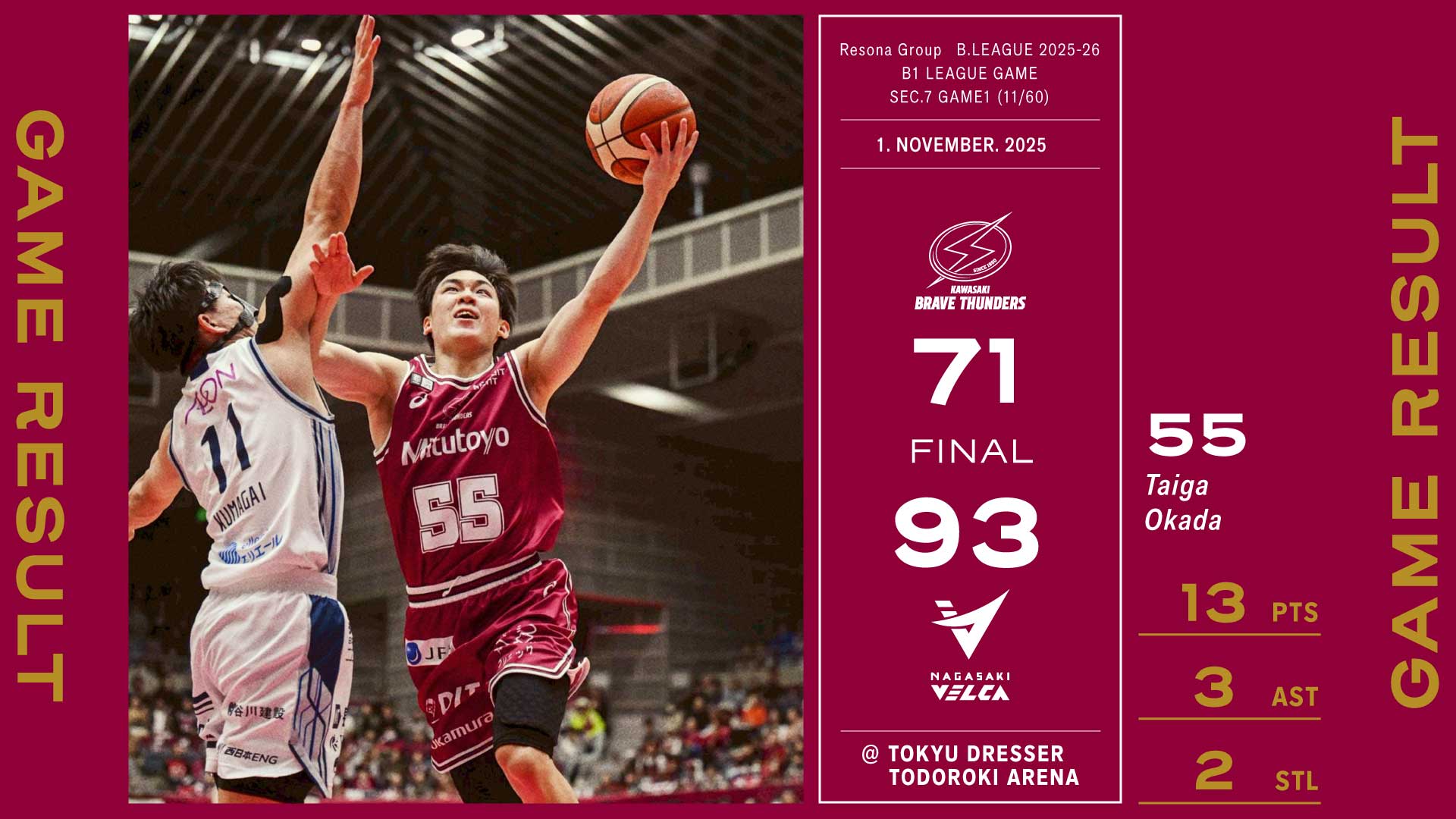 11/1 ●川崎 71-93 長崎○ りそなグループB.LEAGUE 2025-26 B1リーグ戦 第7節GAME1 (11/60)