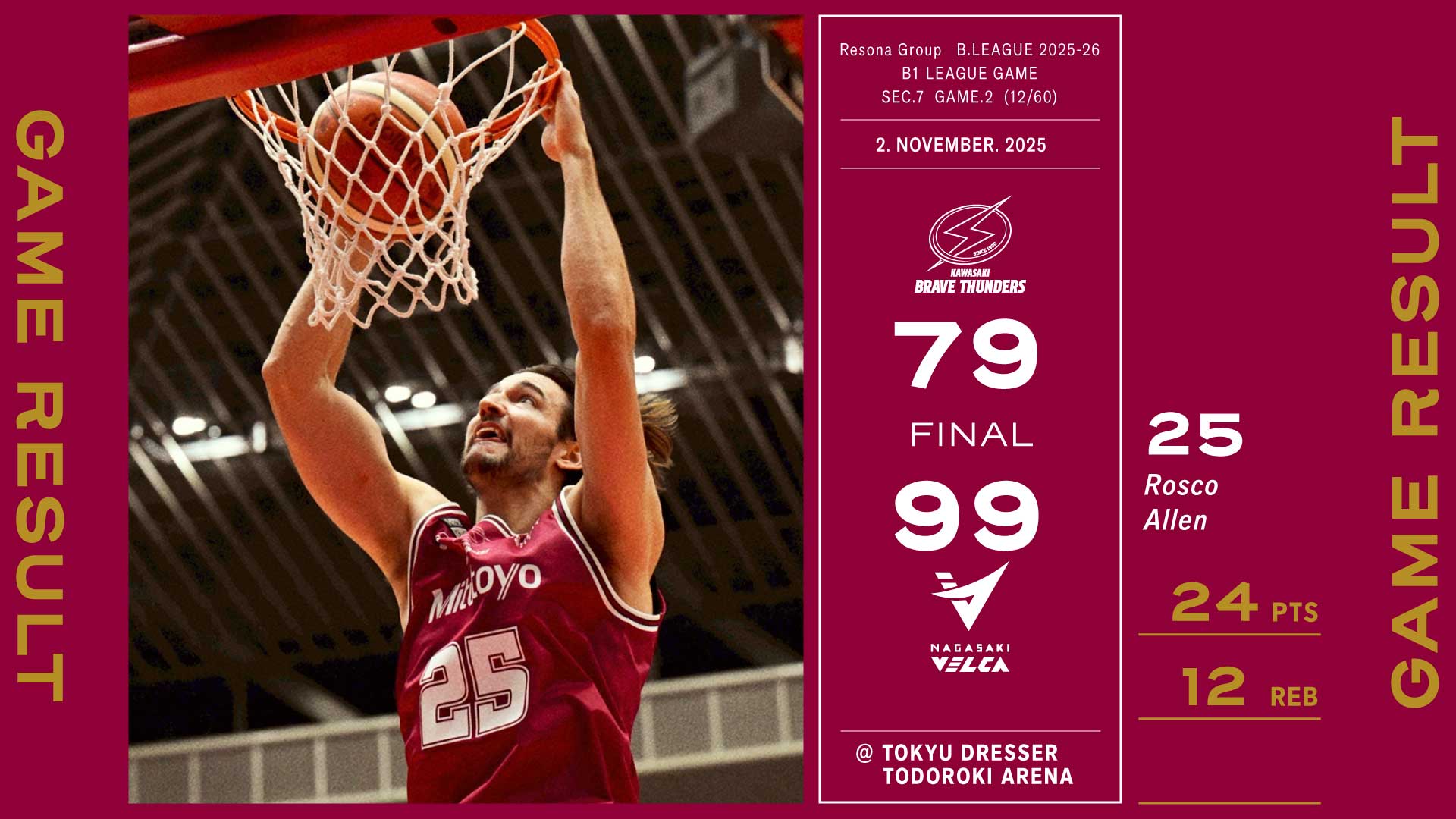11/2 ●川崎 79-99 長崎○ りそなグループB.LEAGUE 2025-26 B1リーグ戦 第7節GAME2 (12/60)