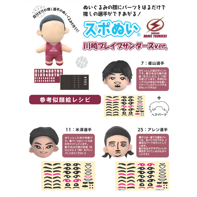川崎ブレイブサンダースのユニフォームを着用したぬいぐるみです。顔と背番号のパーツ、そして髪の毛をイメージに合わせて切って自分だけのぬいぐるみを作ることができます。