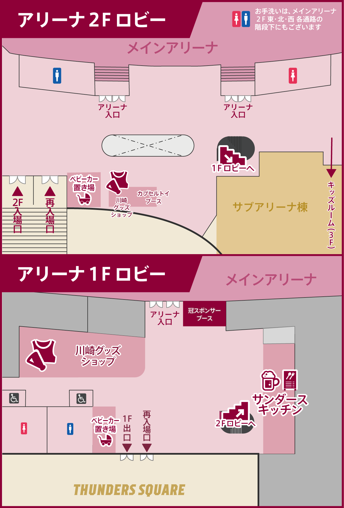 これまでアリーナ2Fロビーに出店していた「サンダースキッチン」は今シーズンは出店いたしません。2F席で観戦のお客さまは、アリーナ1Fロビー、またはサンダーススクエアのサンダースキッチンをご利用ください。なお、これまでサンダースキッチンを出店していた場所には、新しい施策を準備しておりますので、どうぞご期待ください。