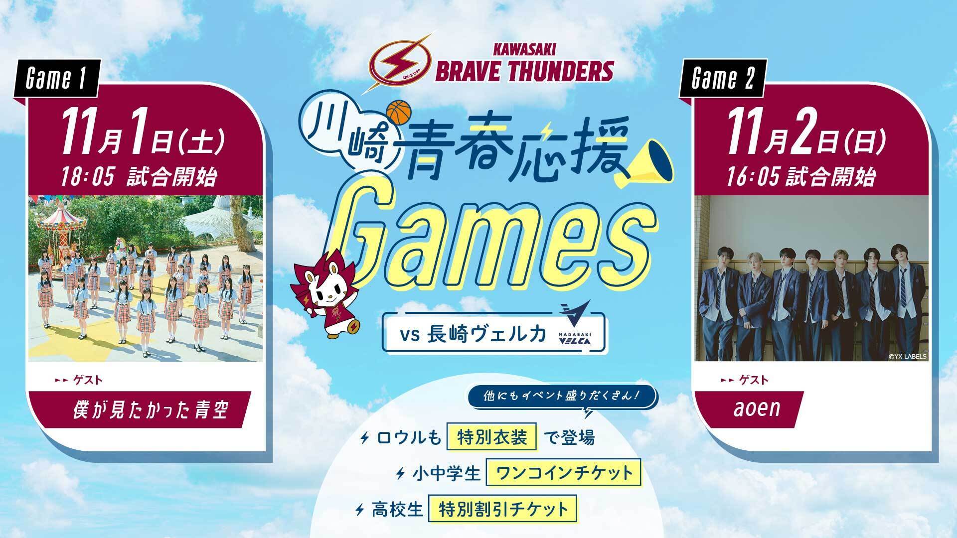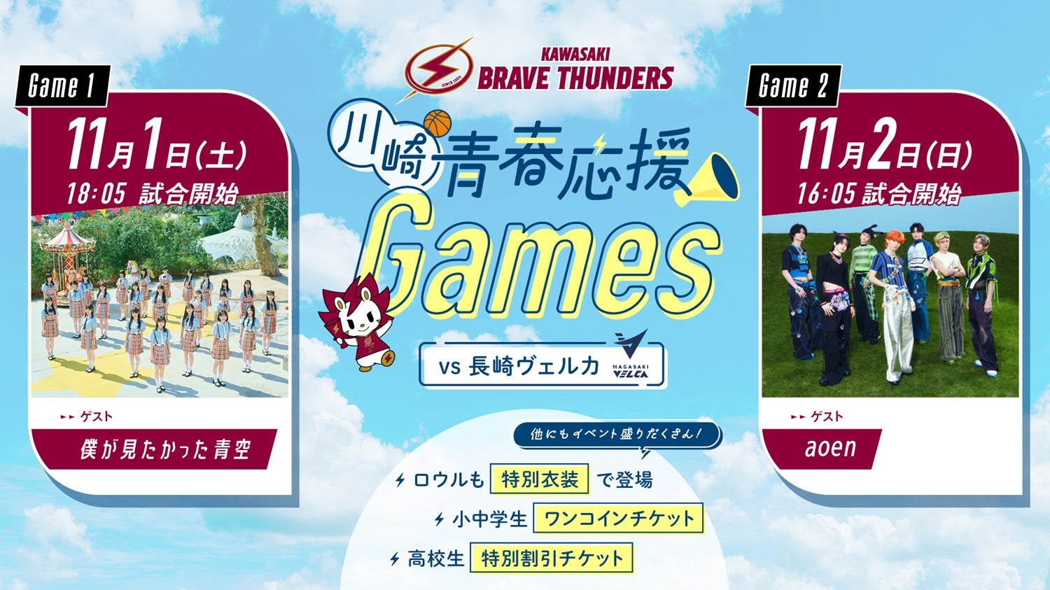 11月1日(土) , 2日(日) 長崎ヴェルカ戦(会場:東急ドレッセとどろきアリーナ)を「川崎青春応援Games」として開催いたします。2日間にわたり、青春にまつわるゲストやイベントが盛りだくさん!