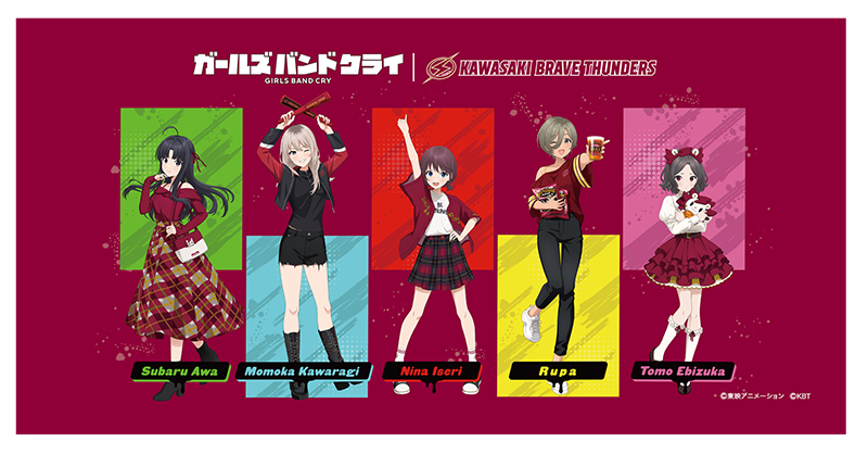 「ガールズバンドクライ」の主要人物であるバンド「トゲナシトゲアリ」メンバー5人(井芹仁菜、河原木桃香、安和すばる、海老塚智、ルパ)が、「川崎ブレイブサンダースの試合を観戦する」スタイルをイメージした、東映アニメーション描き下ろしデザインのラインナップとなります。