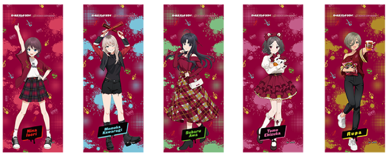 「トゲナシトゲアリ」の5人(井芹仁菜、河原木桃香、安和すばる、海老塚智、ルパ)それぞれのメンバーカラーでデザインしたタオルです。