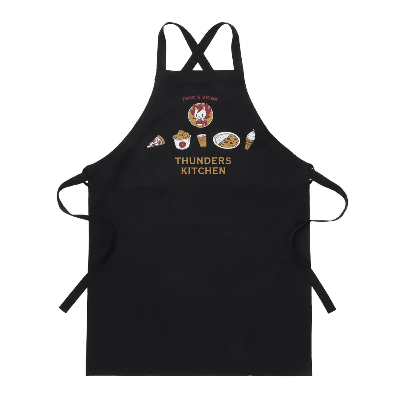 サンダースキッチンのスタッフエプロンをイメージしたロングスリーブTシャツです。サンダーススクエアで販売されているフードを書き下ろししたデザインが袖に追加されています。