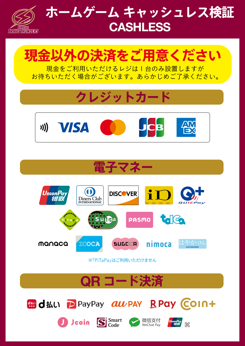 11月12日(水)サンロッカーズ渋谷戦(会場:東急ドレッセとどろきアリーナ)において、アリーナ内1Fオフィシャルグッズショップにてキャッシュレス決済のトライアルを実施いたします。当日、アリーナ内1Fオフィシャルグッズショップをご利用いただく場合、キャッシュレスでの決済にご協力をお願いいたします。
