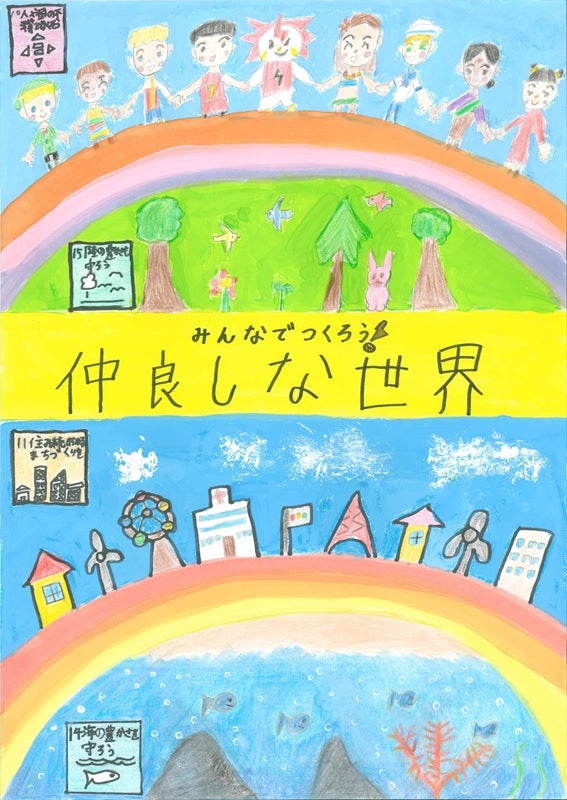 今回の募集テーマは「川崎ブレイブサンダースとSDGs」でした。その中で、弊社としてはSDGs目標11「住み続けられるまちづくり」をテーマとして、未来のかわさきを描いた作品を選ばせていただきました。相磯葉月さんの作品には、観覧車や風車など、未来のかわさきの街を表現しているように感じます。また、ロウル君を中心に 世界中の人々が手を取り合う姿から、国や性別、様々な”違い”を 受け入れ、共に歩む社会の希望を感じることができました 。杉本電機産業が目指す、「川崎の街づくりへの貢献」に通じるものがあったため、この作品を杉本電機産業賞に選ばせていただきました 。