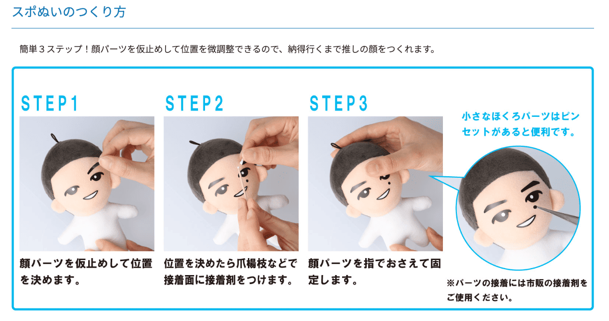 顔パーツ、背番号パーツを組み合わせるだけで簡単に自分だけの推し選手がつくれる、スポーツ選手向け推しぬいぐるみです。
