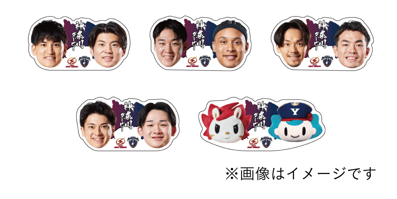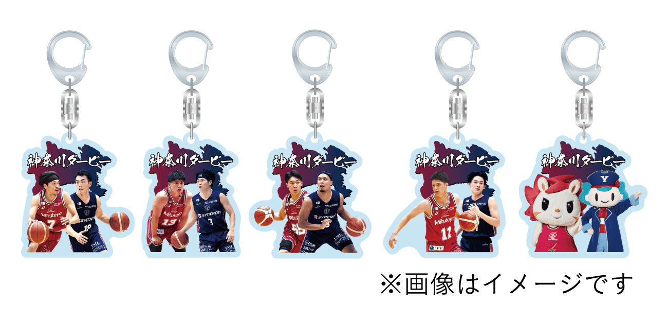 キービジュアルに起用されている選手と東山高校出身の米須選手(川崎)と佐藤凪選手(横浜BC)、そしてマスコットが加わったアクリルキーホルダーです。