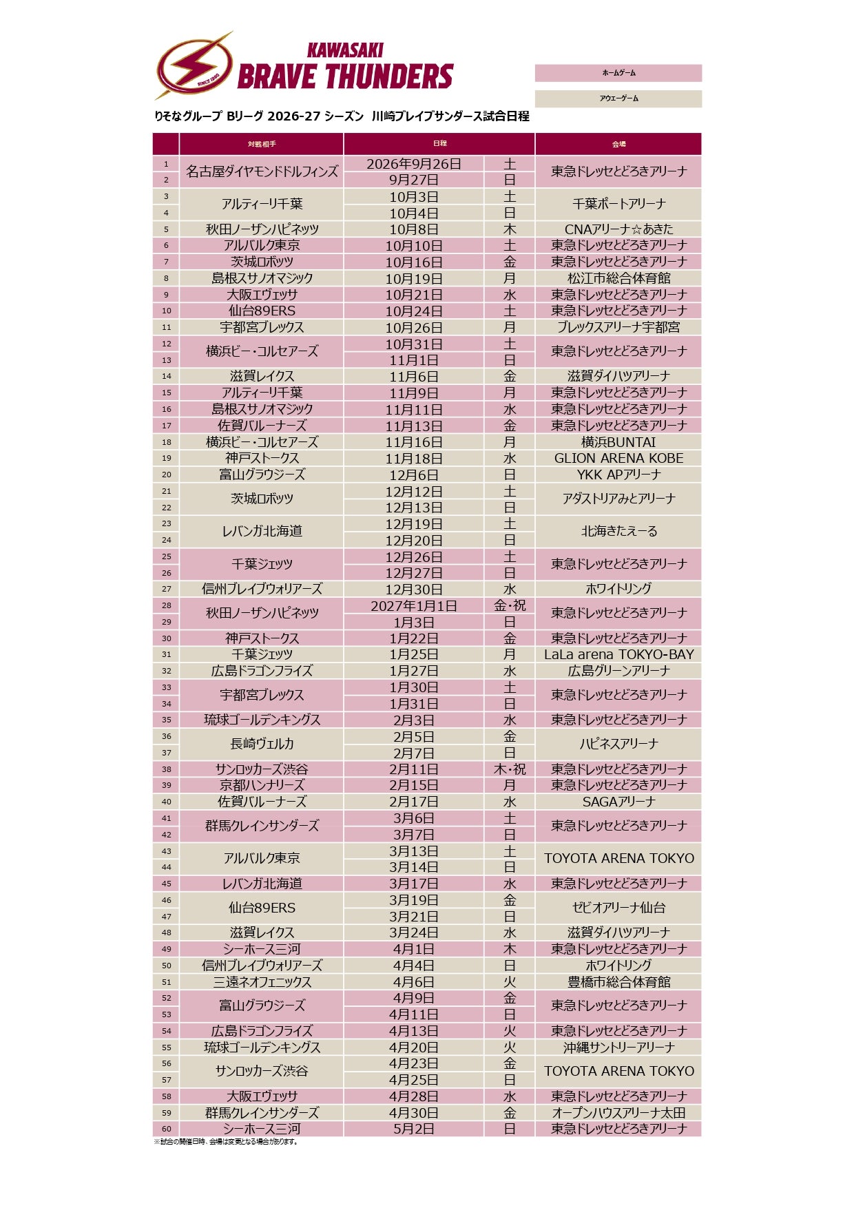 りそなグループ B.LEAGUE 2026-27 B.LEAGUE PREMIER リーグ戦 川崎ブレイブサンダース試合日程表(PDF)