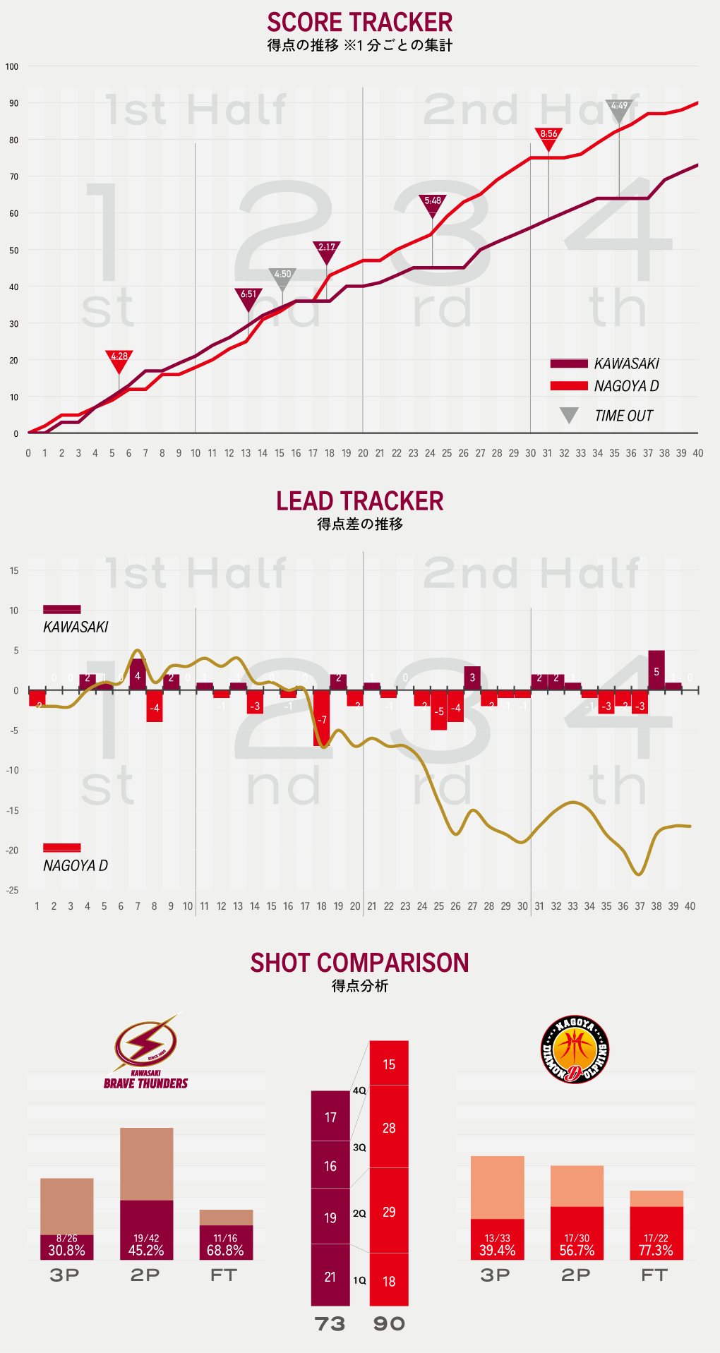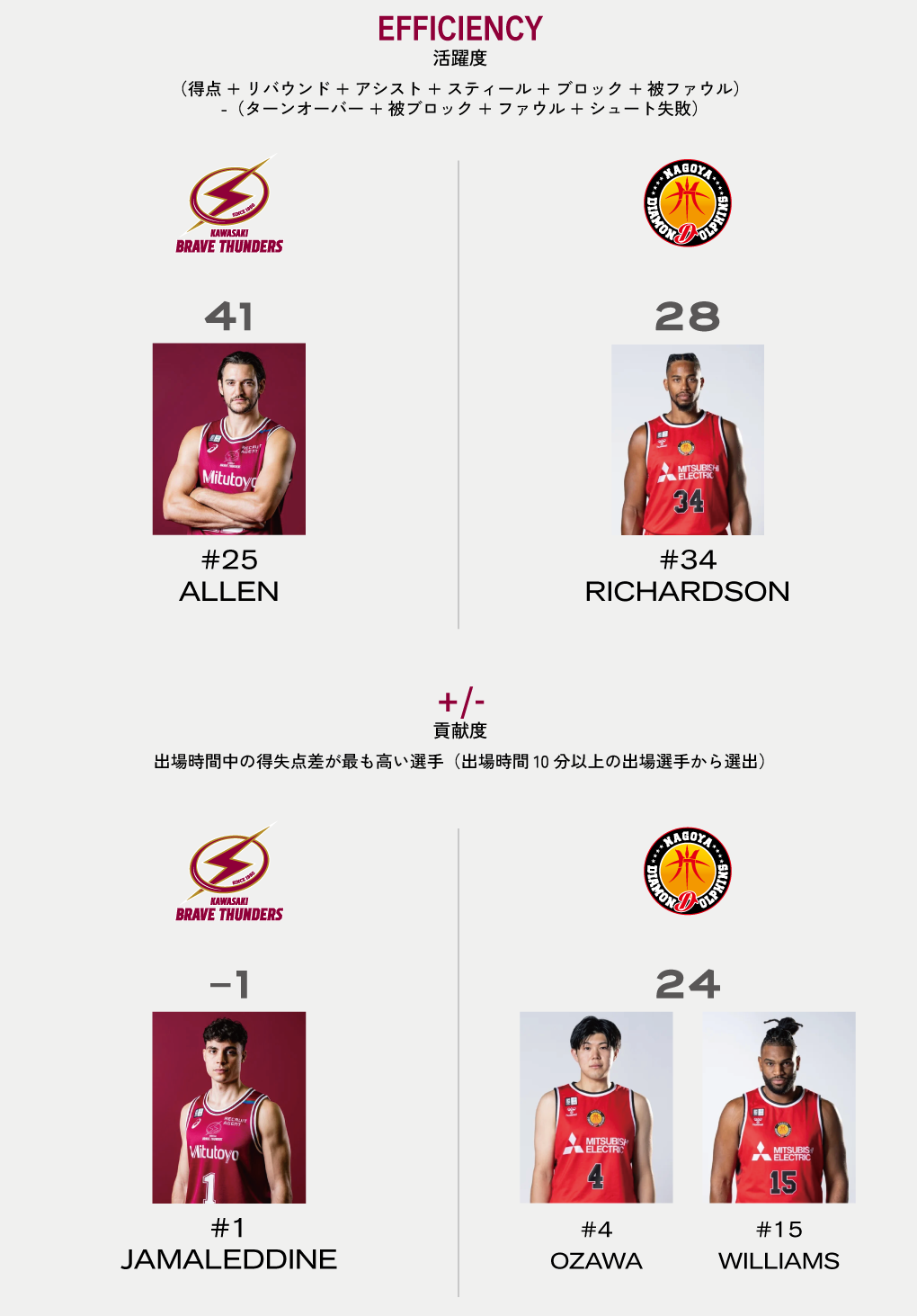 動画や画像に掲載されている数値・グラフ等の情報は、試合当日のスタッツが確定となった時点での数値となっております。後日記録が修正される場合がございますので、予めご了承ください。正式な情報はBリーグの公式WEBサイトでご確認ください。