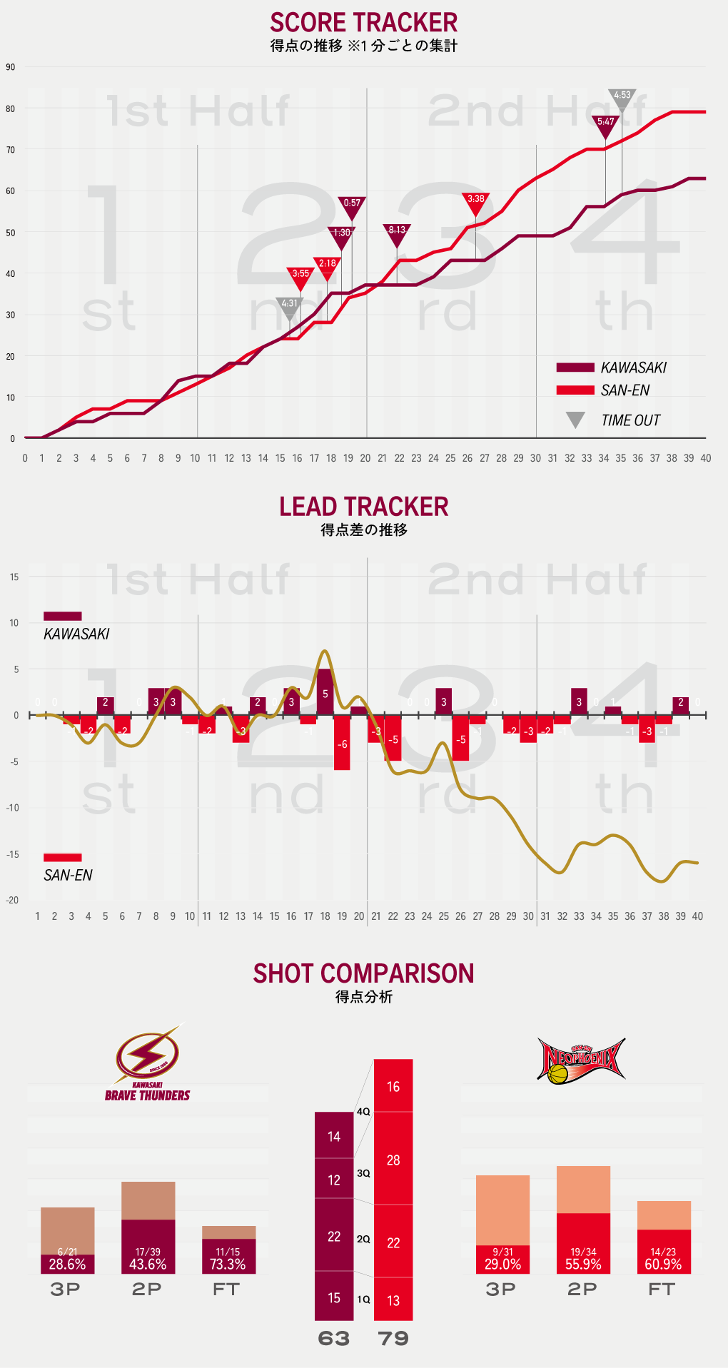 動画や画像に掲載されている数値・グラフ等の情報は、試合当日のスタッツが確定となった時点での数値となっております。後日記録が修正される場合がございますので、予めご了承ください。正式な情報はBリーグの公式WEBサイトでご確認ください。