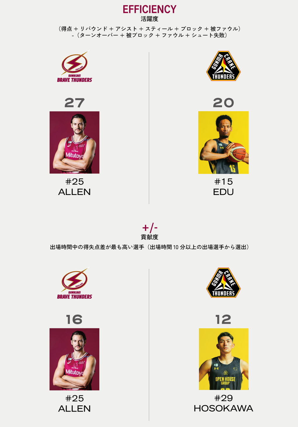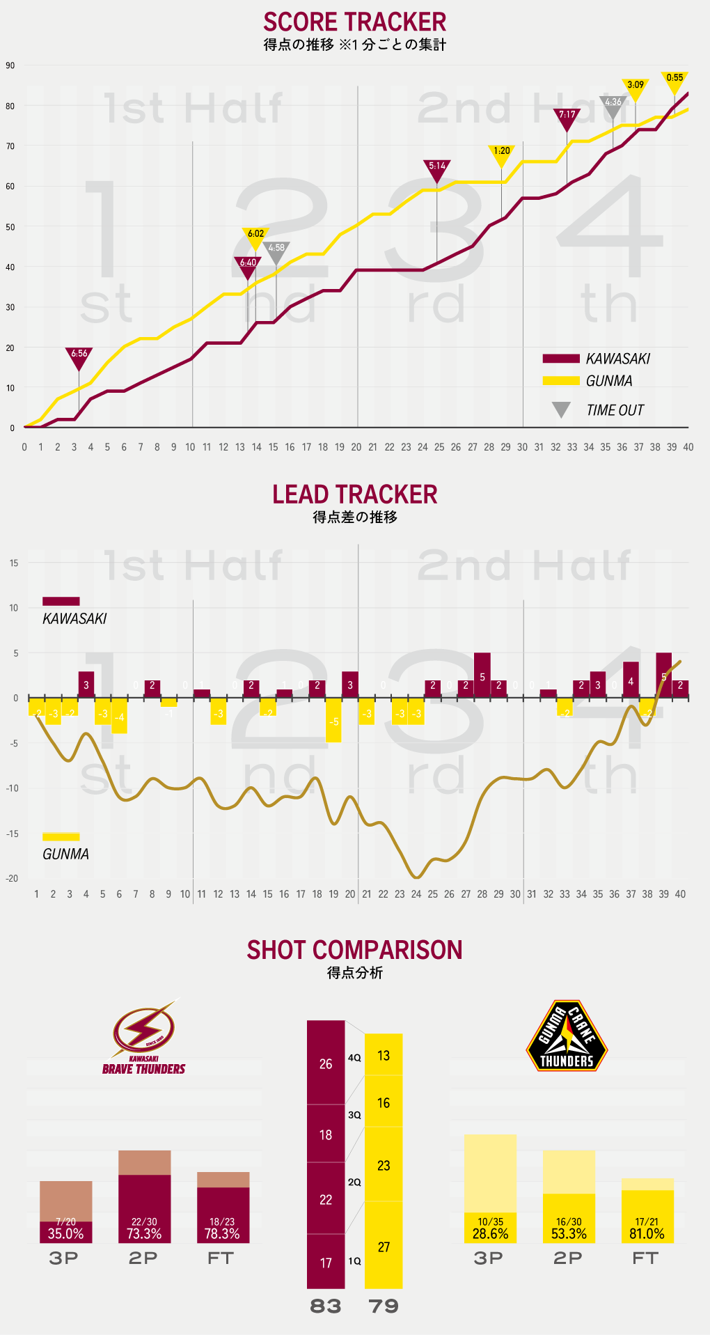 動画や画像に掲載されている数値・グラフ等の情報は、試合当日のスタッツが確定となった時点での数値となっております。後日記録が修正される場合がございますので、予めご了承ください。正式な情報はBリーグの公式WEBサイトでご確認ください。