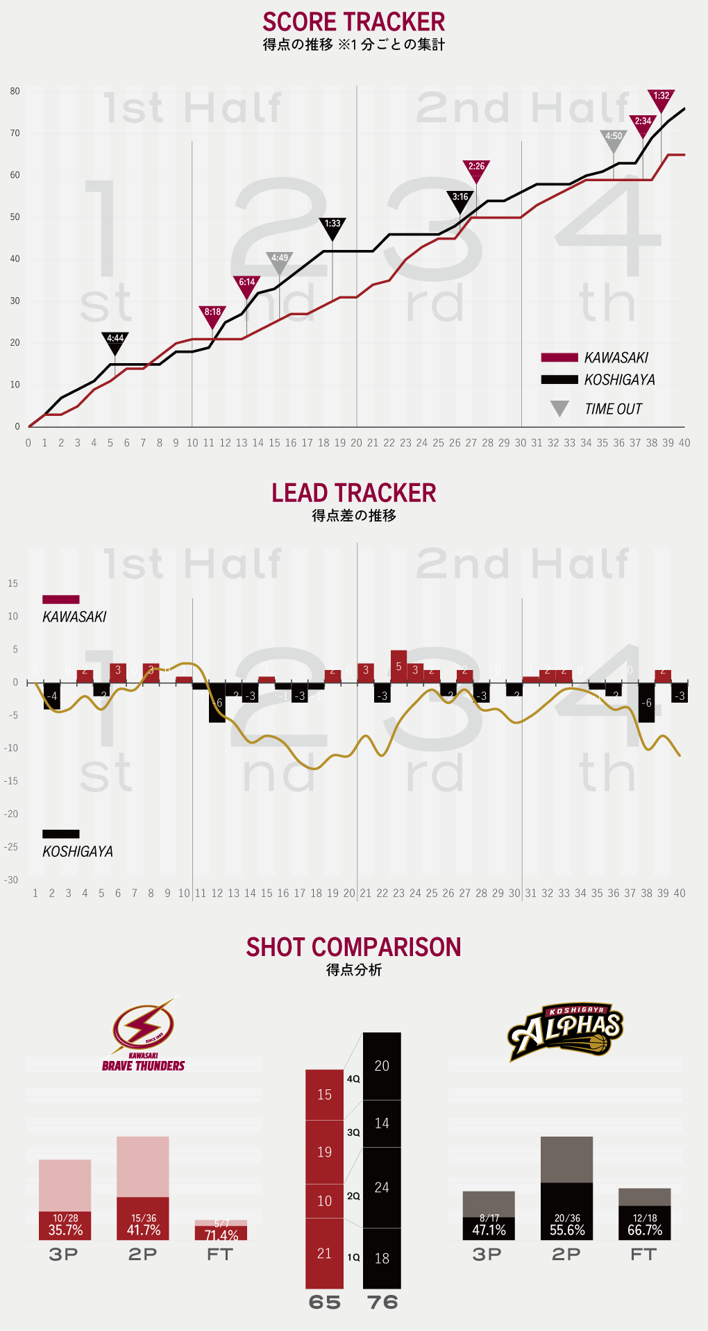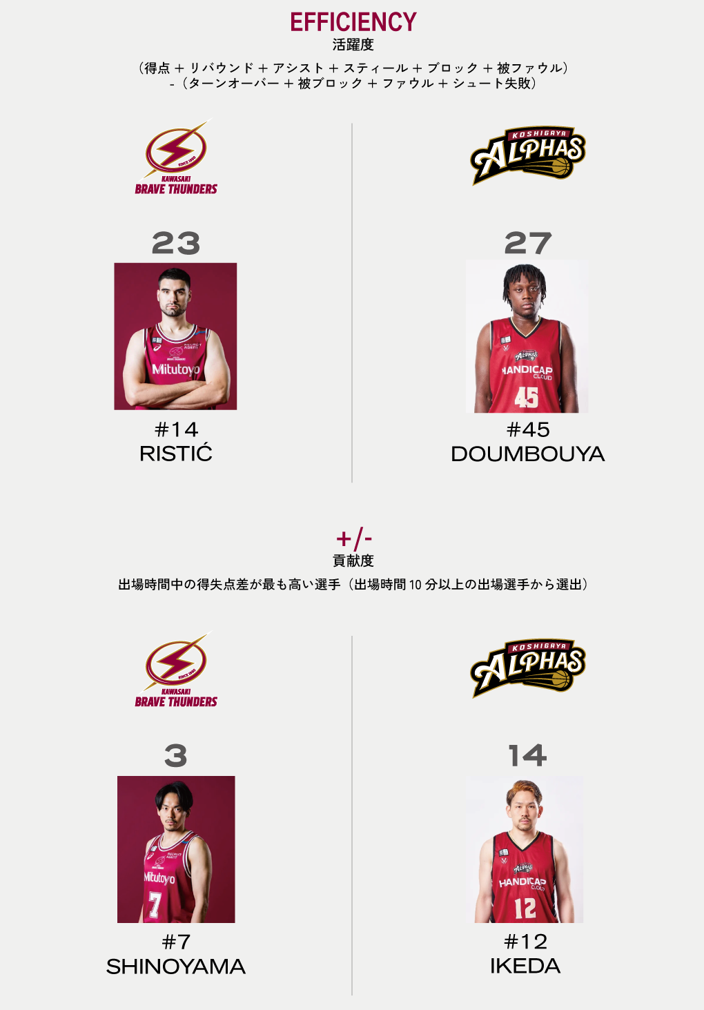 動画や画像に掲載されている数値・グラフ等の情報は、試合当日のスタッツが確定となった時点での数値となっております。後日記録が修正される場合がございますので、予めご了承ください。正式な情報はBリーグの公式WEBサイトでご確認ください。