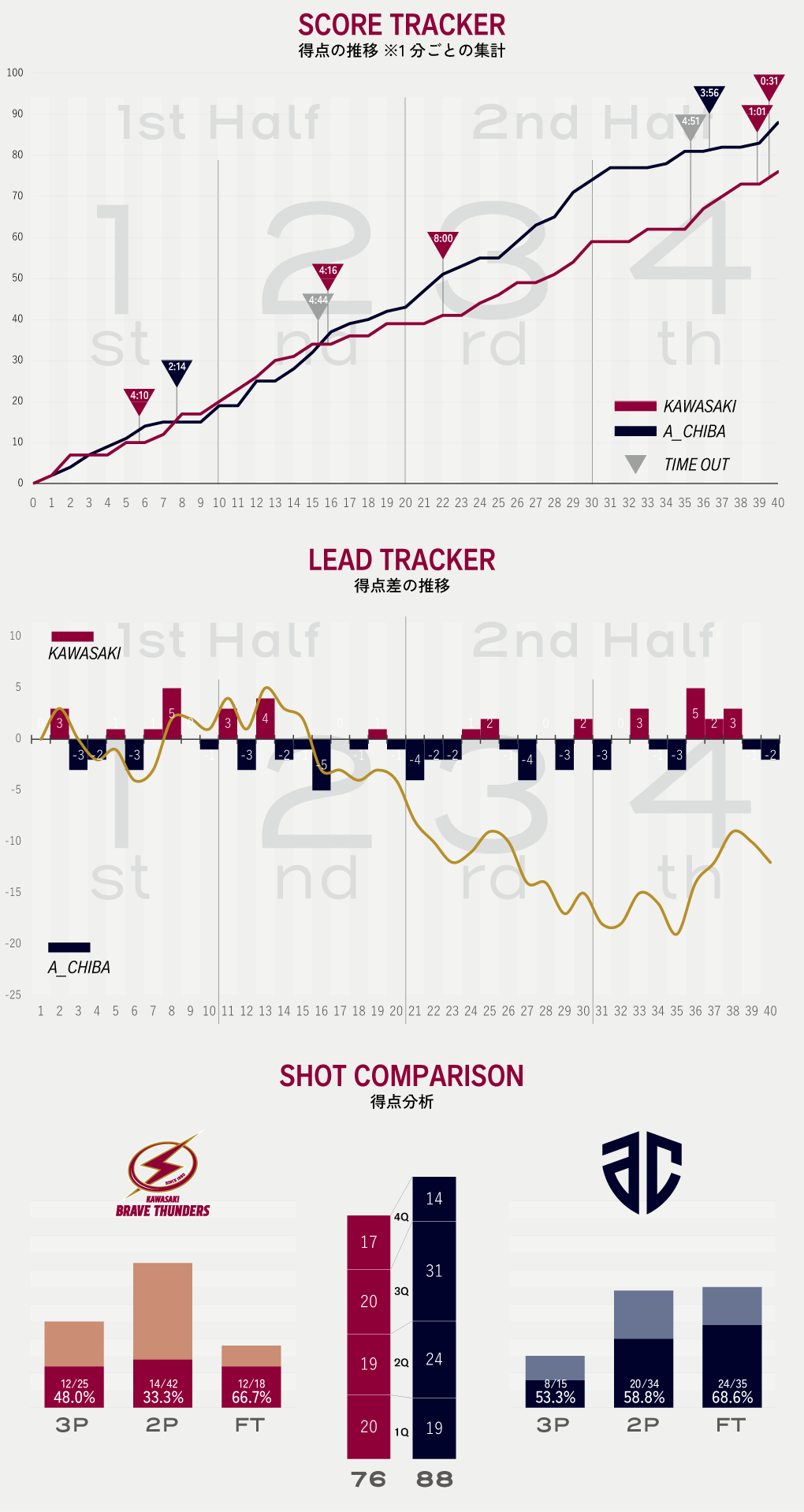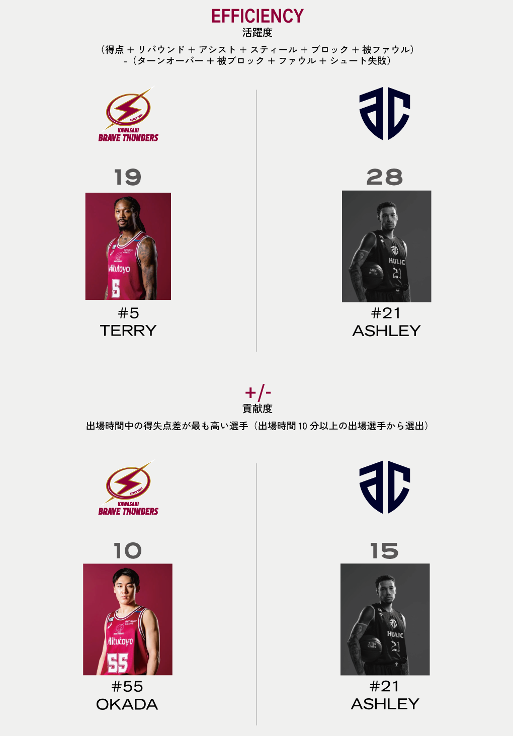 動画や画像に掲載されている数値・グラフ等の情報は、試合当日のスタッツが確定となった時点での数値となっております。後日記録が修正される場合がございますので、予めご了承ください。正式な情報はBリーグの公式WEBサイトでご確認ください。