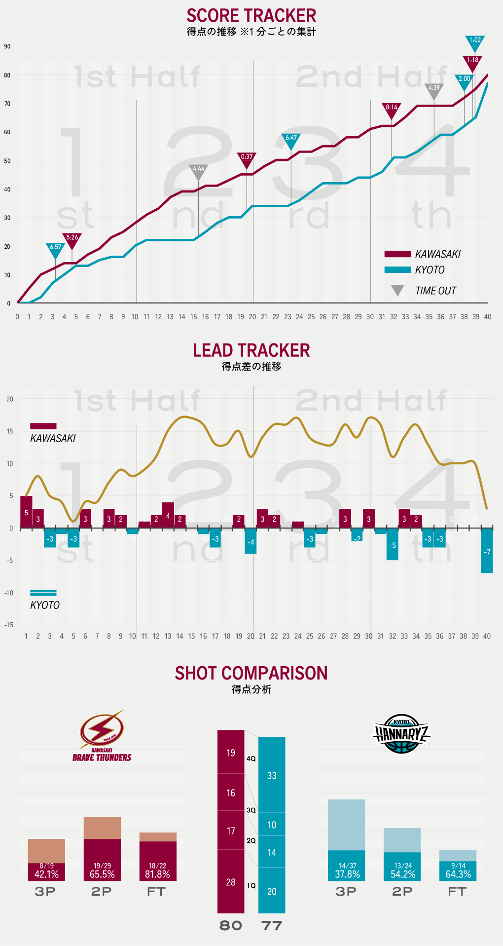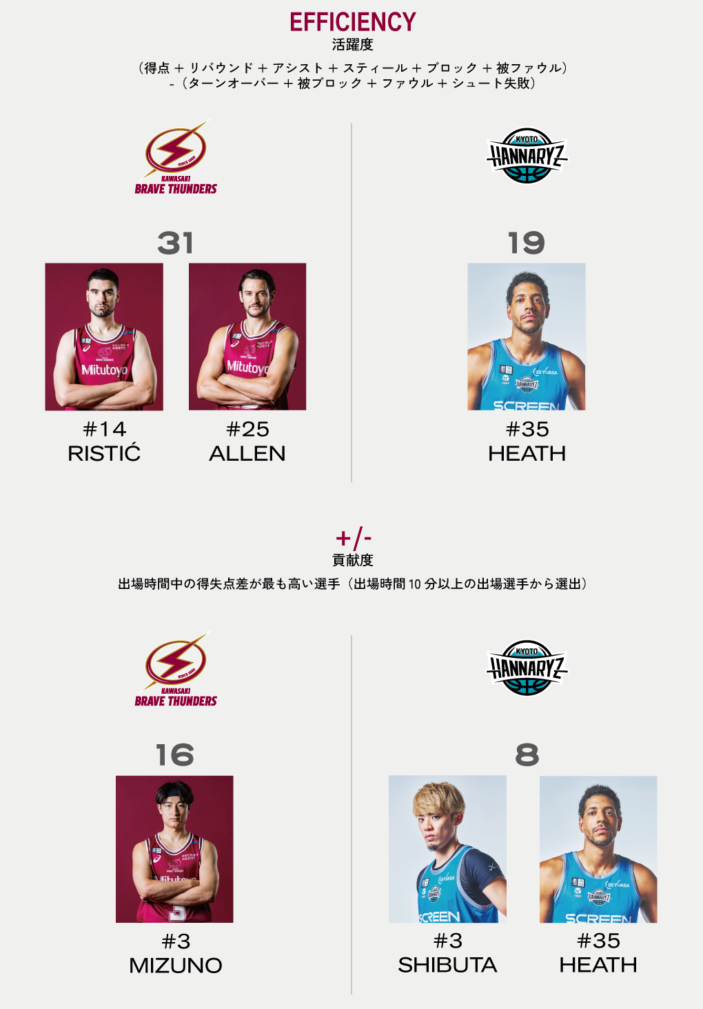 動画や画像に掲載されている数値・グラフ等の情報は、試合当日のスタッツが確定となった時点での数値となっております。後日記録が修正される場合がございますので、予めご了承ください。正式な情報はBリーグの公式WEBサイトでご確認ください。