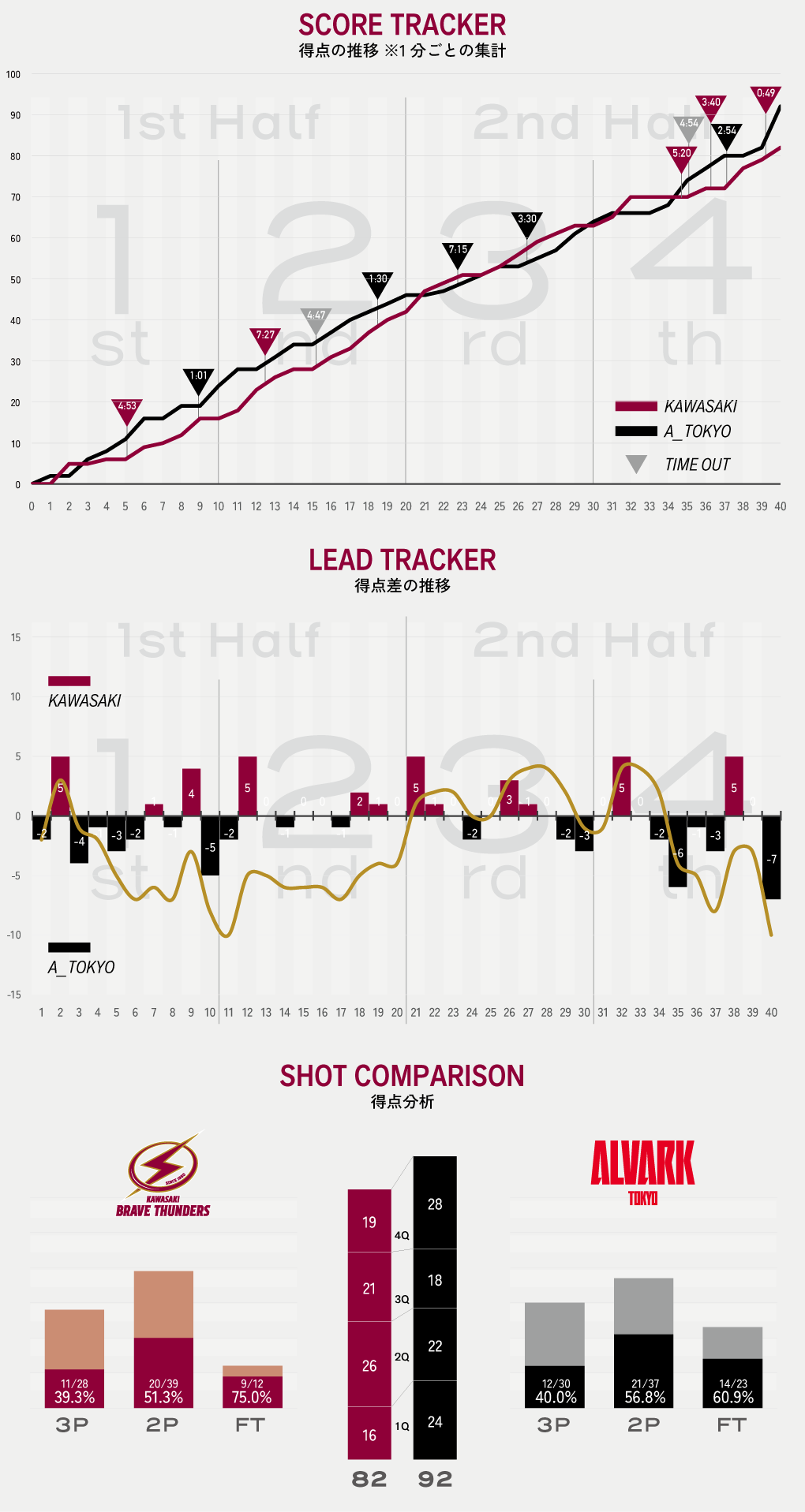 動画や画像に掲載されている数値・グラフ等の情報は、試合当日のスタッツが確定となった時点での数値となっております。後日記録が修正される場合がございますので、予めご了承ください。正式な情報はBリーグの公式WEBサイトでご確認ください。